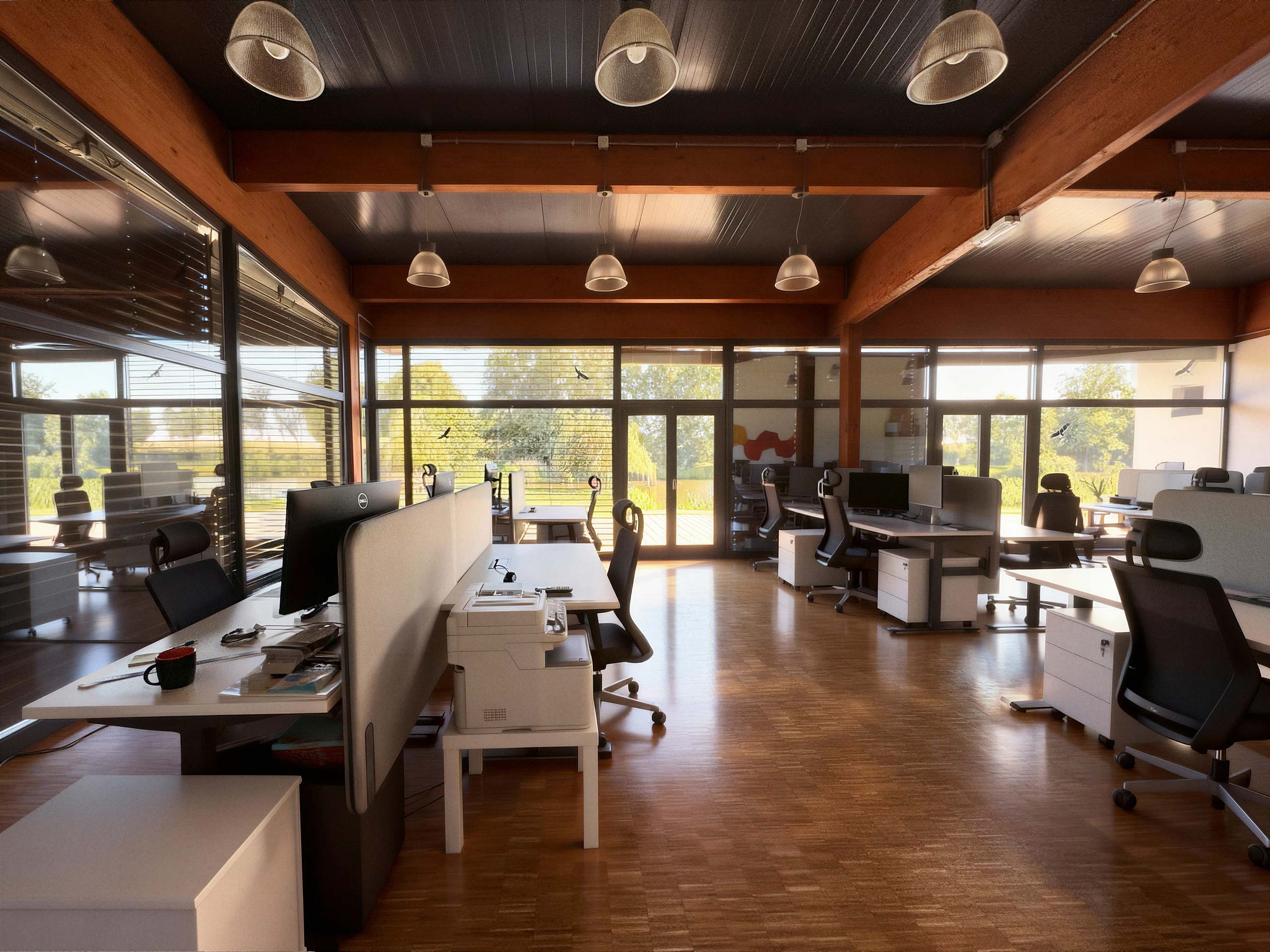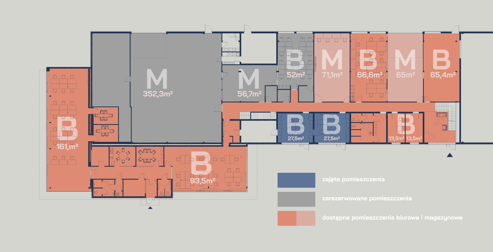 Biura zlokalizowane na parterze i piętrze — od kameralnych gabinetów po przestrzenie typu open space do indywidualnej aranżacji. Różnorodne metraże, ekspozycja południowa oraz bezpośredni dostęp do części magazynowej pozwalają elastycznie dopasować przestrzeń do charakteru działalności.