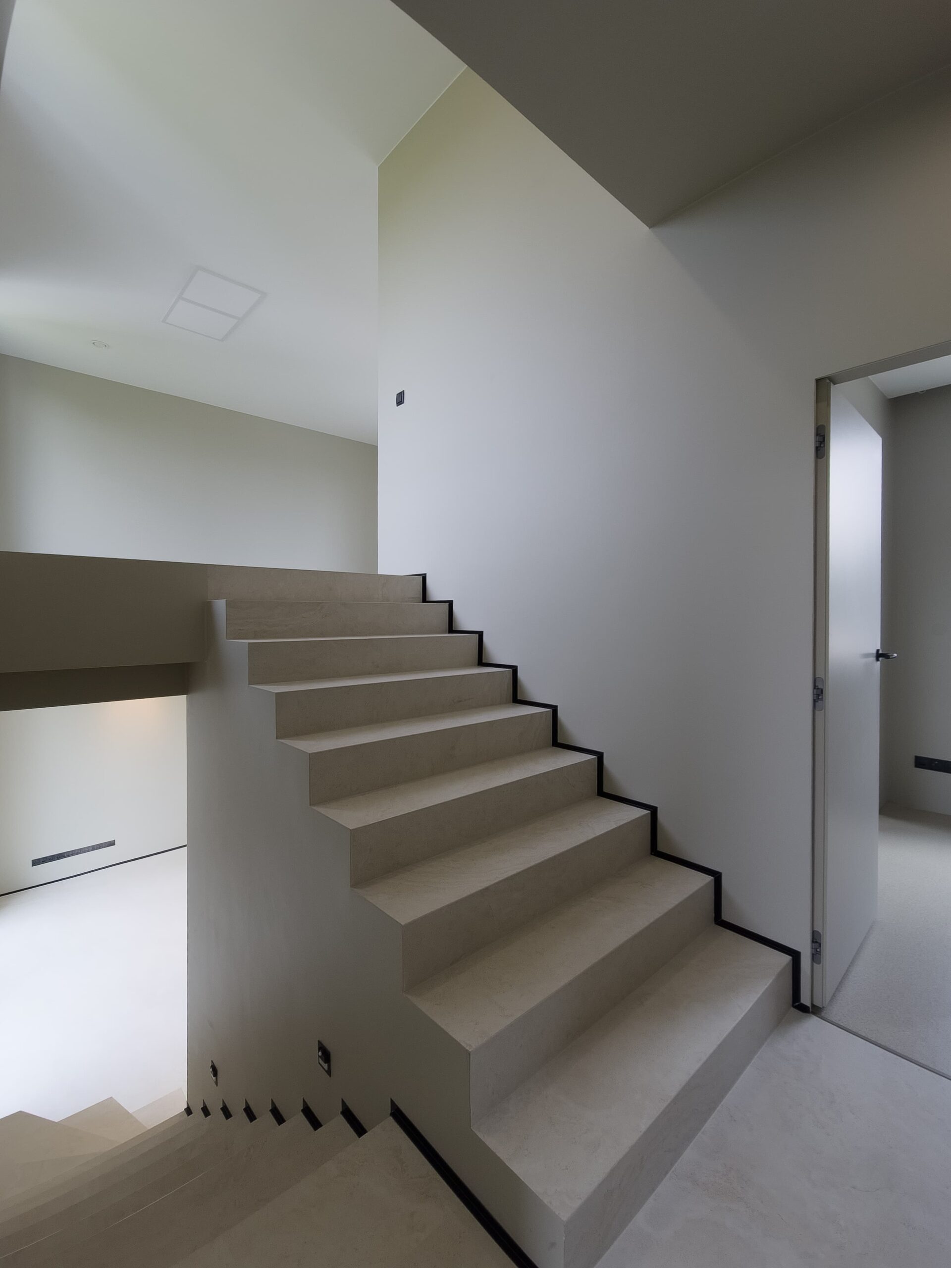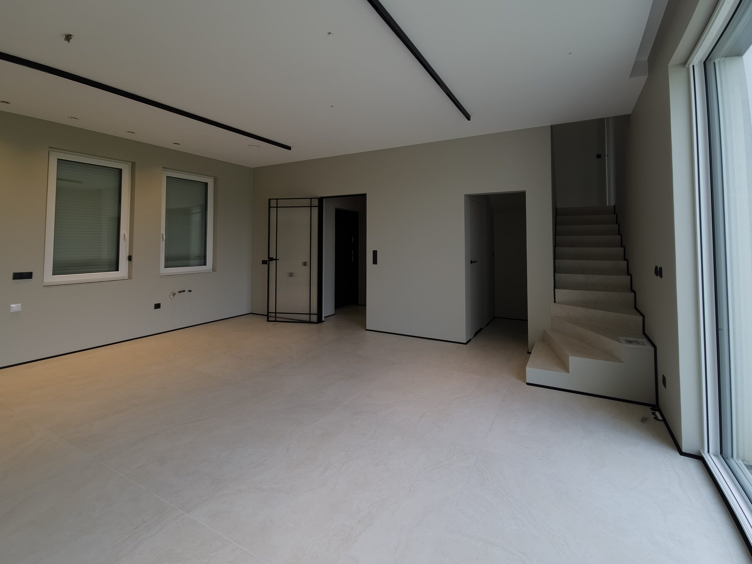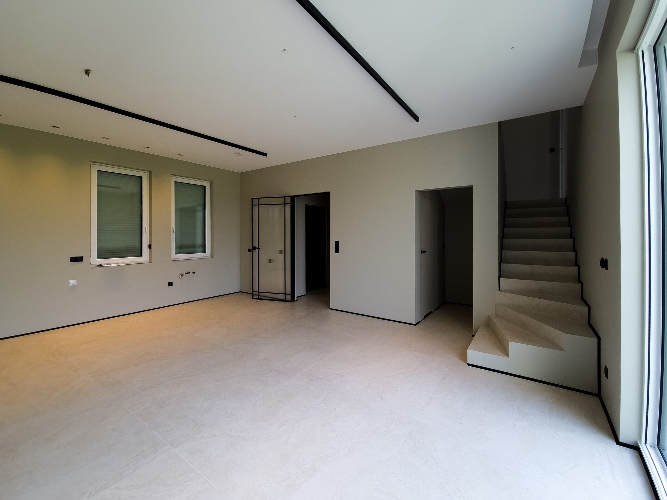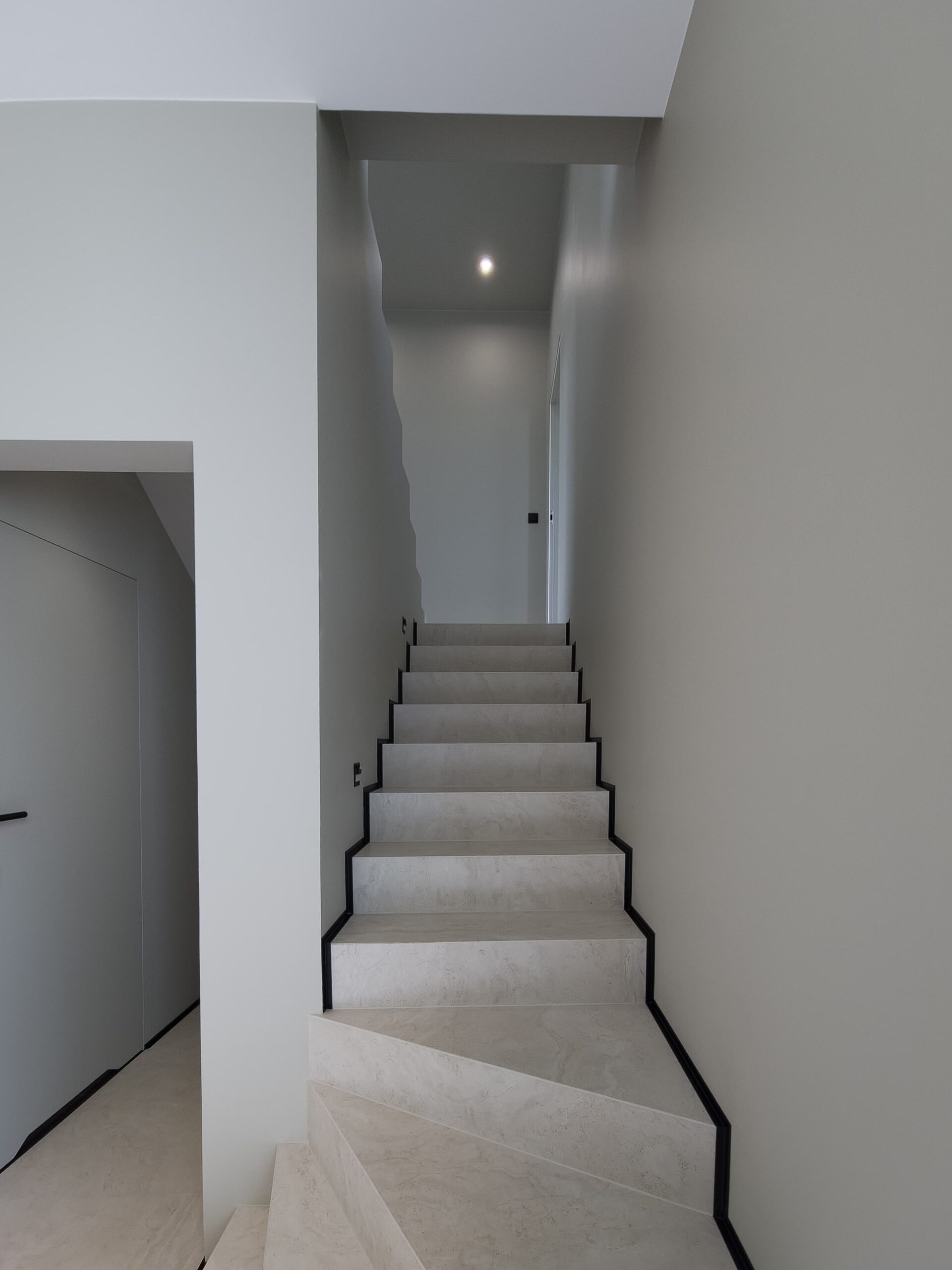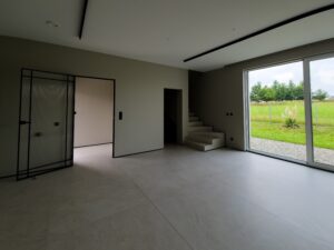 • Płytki gresowe – trwałe i estetyczne wykończenie podłogi strefy wejścia, salonu i schodów wraz ze spocznikami płytkami o dużym formacie 120 x 120 cm, a w garażu oraz pomieszczeniu technicznym w formacie 60 x 60 cm.