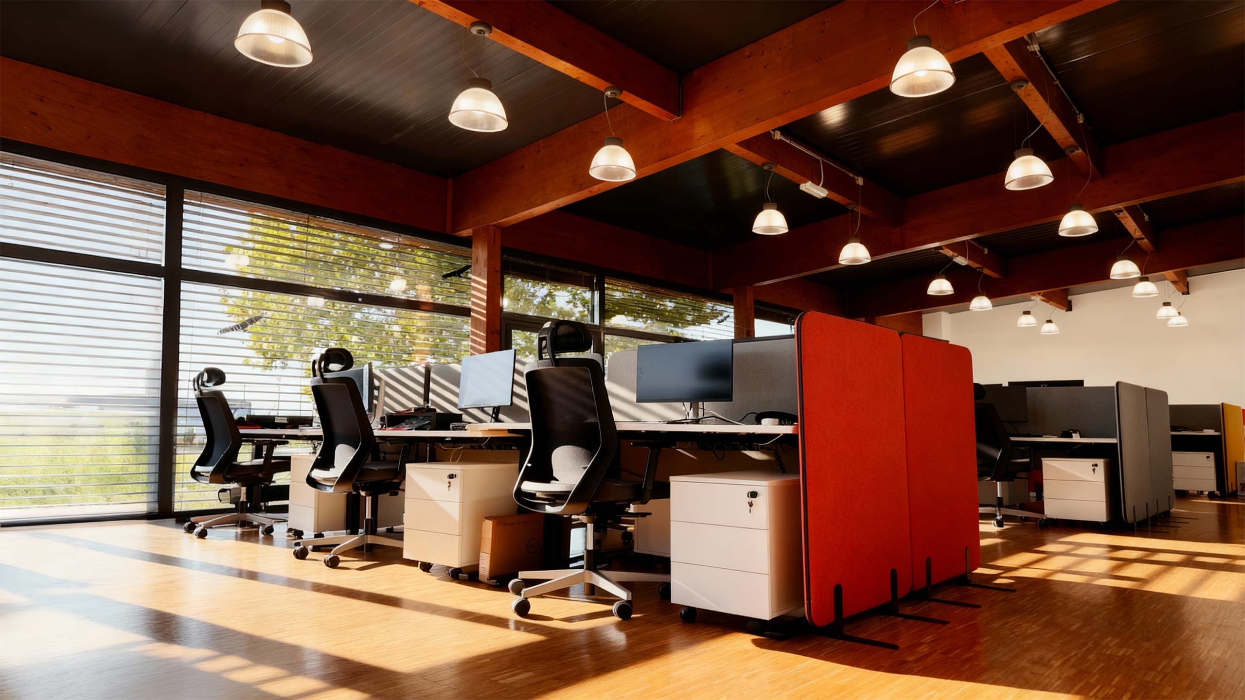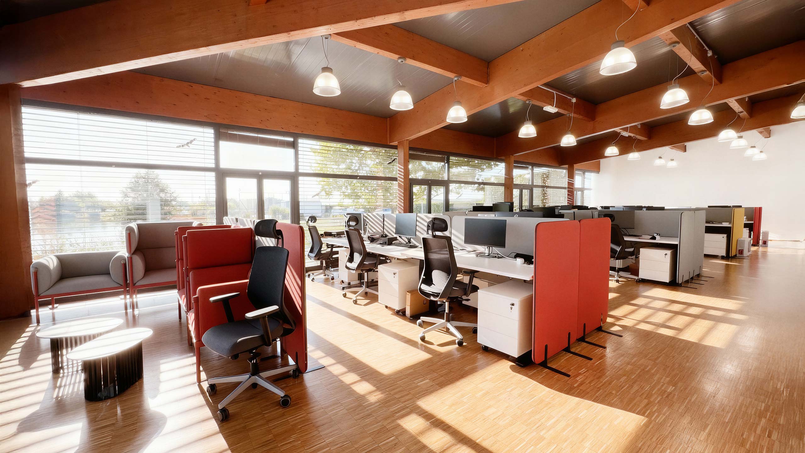 Przestronne, pełne naturalnego światła biura z panoramicznymi przeszkleniami i widokiem na stawy. Otwarta, reprezentacyjna przestrzeń oferuje szerokie możliwości aranżacyjne, mniejsze sale idealnie sprawdzą się jako eleganckie gabinety lub kameralne przestrzenie spotkań.